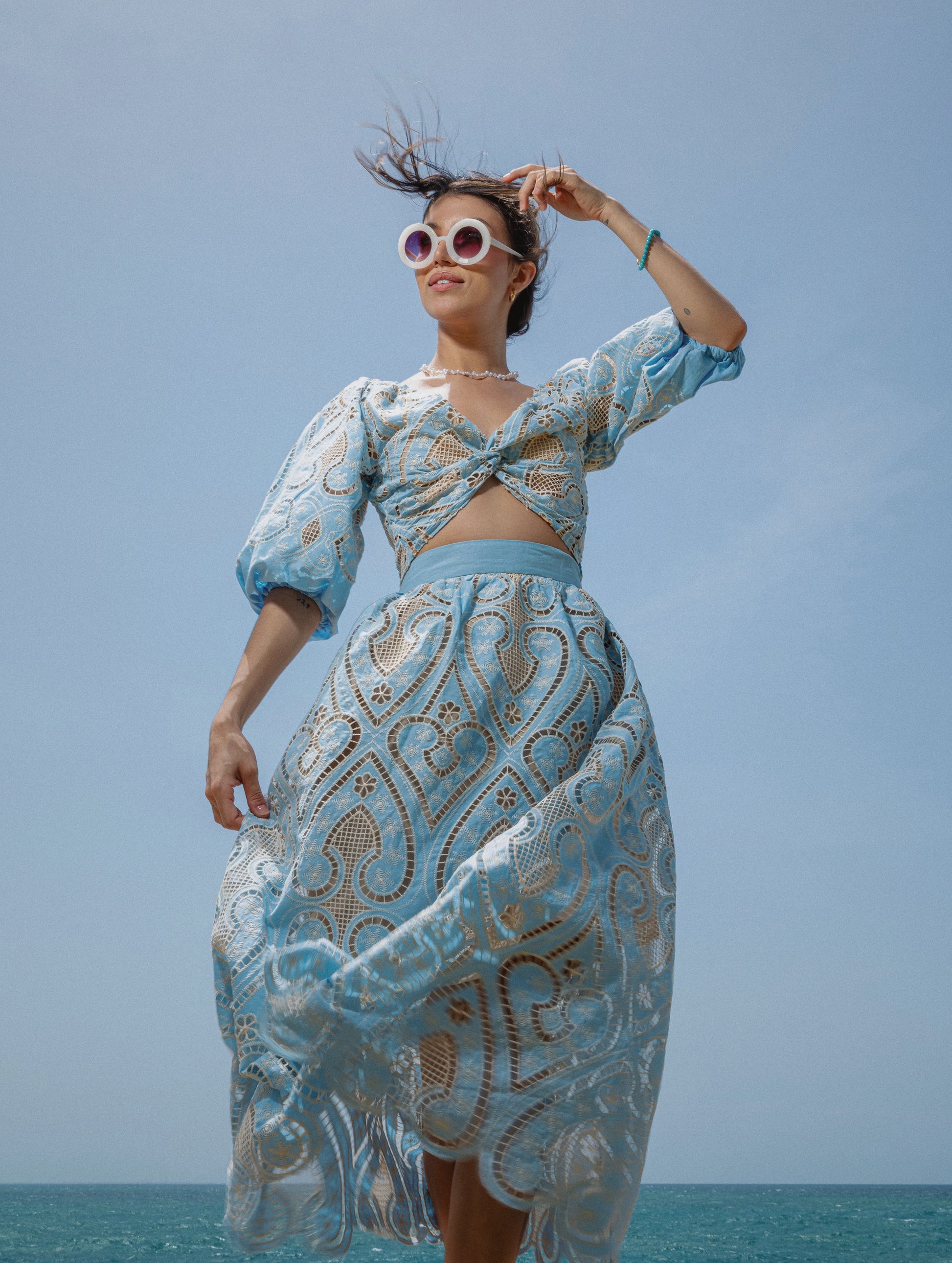 Maxi skirt with side pockets in embroided blue cotton eyelet