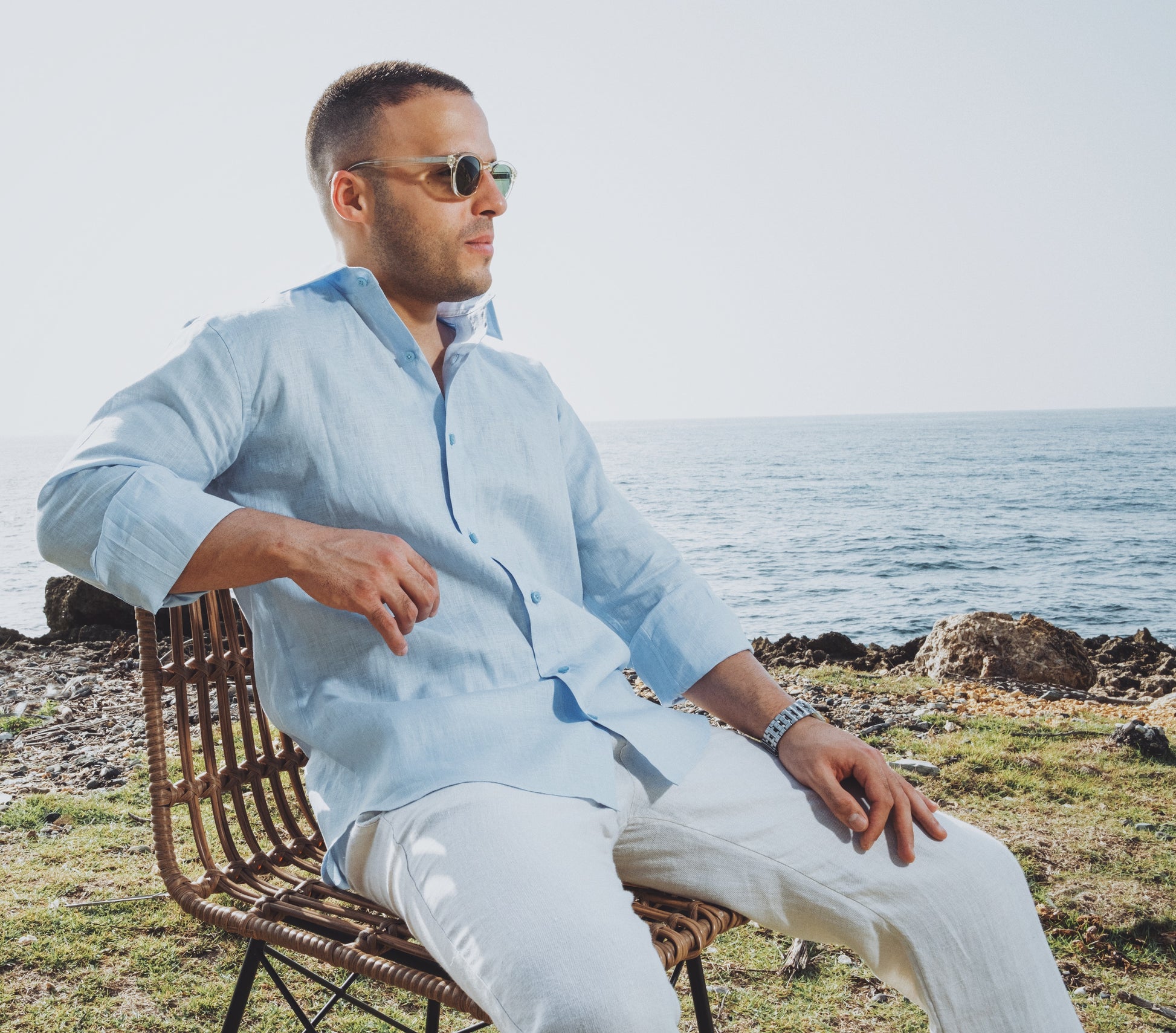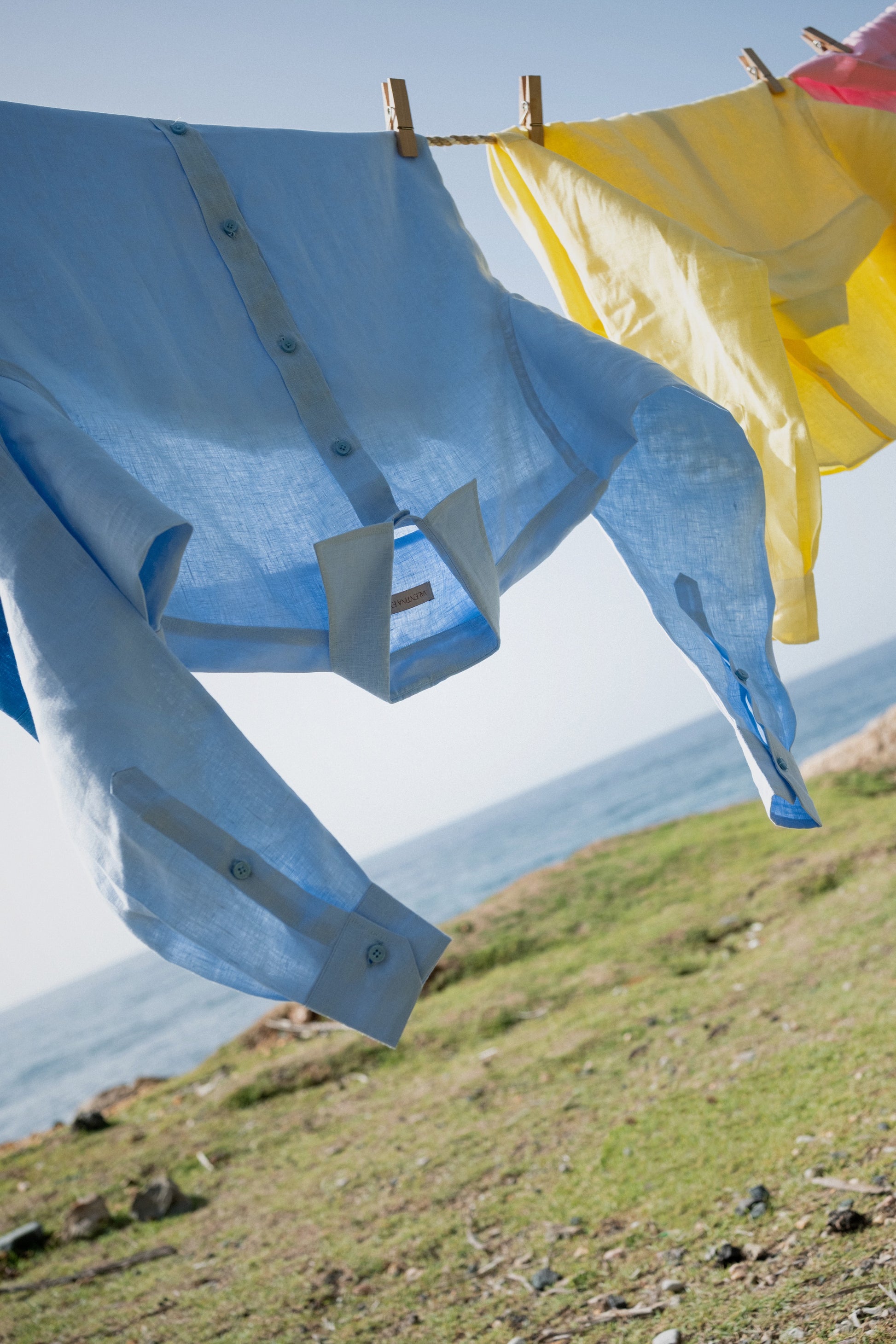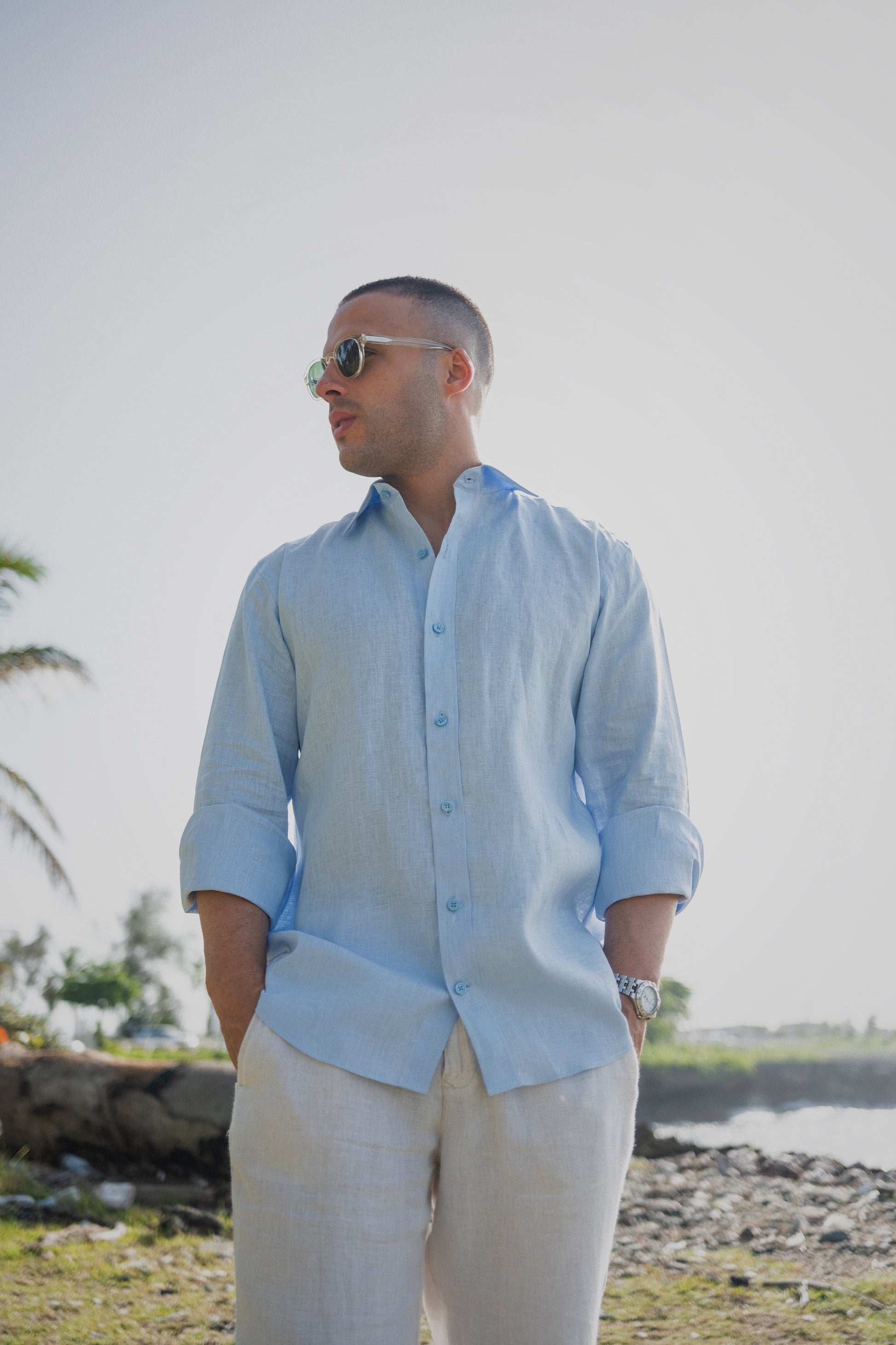 Camisa en 100% lino azúl claro mangas largas, cuello tradicional.