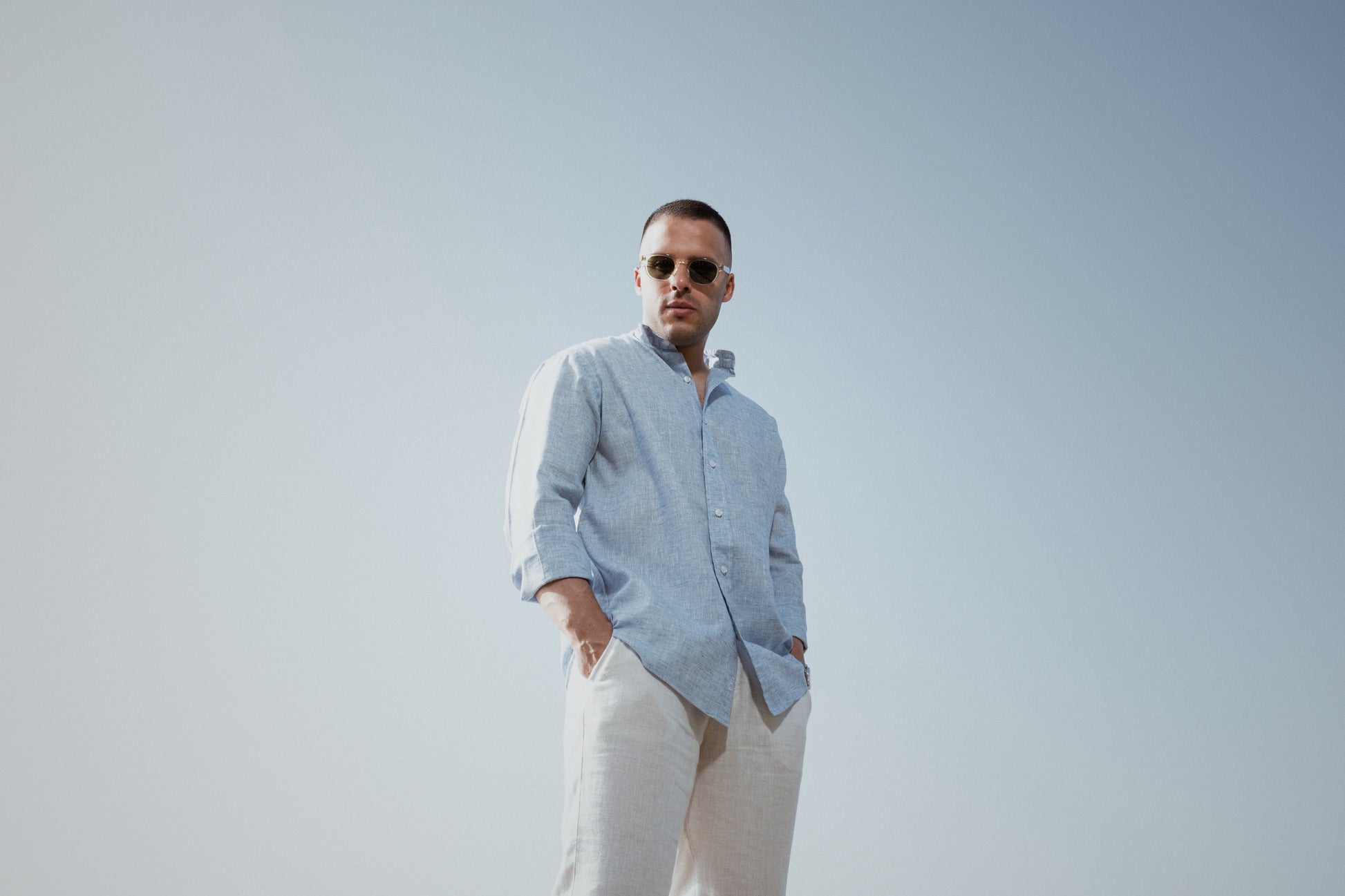 Camisa confeccionada en lino mixto con algodón. Mangas largas, cuello Mao.